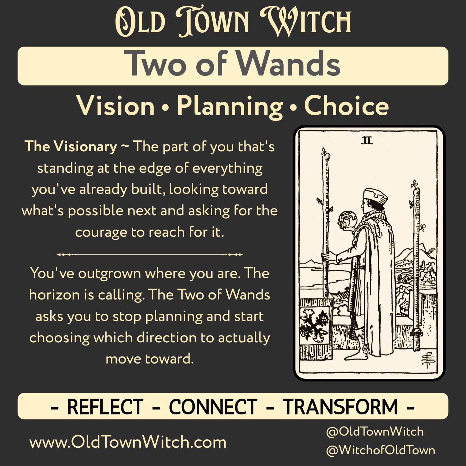 The growth point is making the choice. Not someday. Not when conditions are perfect. The Two of Wands doesn’t reward endless planning. It rewards the moment you decide. The tension lives in the gap between holding your current position safely and trusting that what you’ve built gives you the foundation to reach for something new. You’re being challenged to stop treating vision as a luxury and start treating it as a direction.